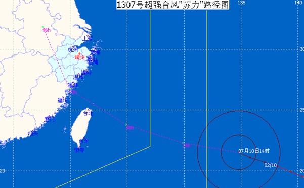 今年第7号热带风暴“苏力”(SOULIK,名字来源:密克罗尼西亚,名字意义:波纳佩岛传统将领的头衔)于7月8日08时在台湾省台北市东偏南方向的西北太平洋洋面上生成,9日02时加强为强热带风暴,08时加强为台风。10日02时加强为超强台风,今天14点其中心位于距离嵊州东南偏东方向大约1670公里的洋面上,也就是在北纬21.5度,东经134.8度,中心气压935百帕,近中心最大风力16级(55米/秒) ,七级风圈半径380公里,十级风圈半径160公里,目前超强台风中心正以每小时15到20公里的速度向西北偏西方向移动,预计“苏力”未来继续以每小时20公里的速度向西北偏西方向移动,强度继续增强。