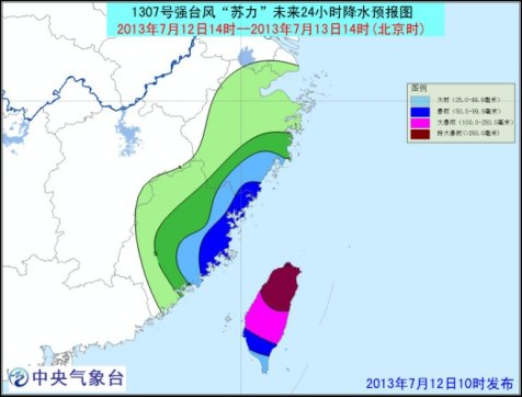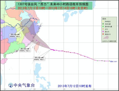 据中央及省气象部门消息,今年第7号强台风“苏力”的中心7月12日5时位于北纬22.7度、东经126.5度,在我国台湾省台北市东偏南方大约570公里的西北太平洋洋面上,中心附近最大风力有15级(48米/秒)。预计,“苏力”将以每小时20公里左右的速度向西北方向移动,将于13日中午至傍晚在福建北部至浙江南部一带沿海登陆。
