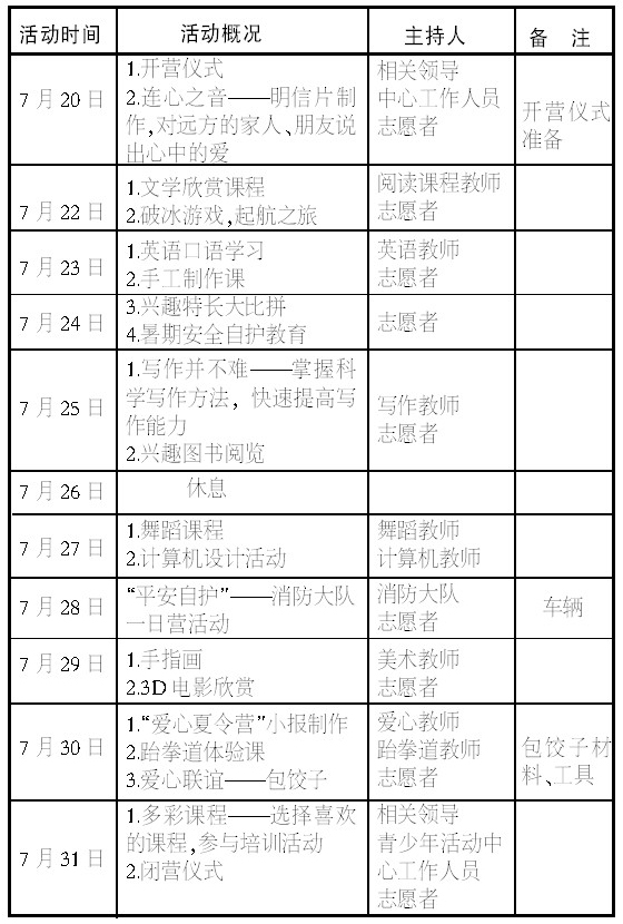 本次暑期公益夏令营活动时间从7月20日开始,7月31日结束。具体活动安排如下: