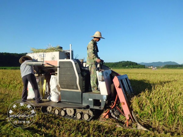 昨日上午,三界镇沈湖村的田野上,6台收割机正忙于收割早稻。