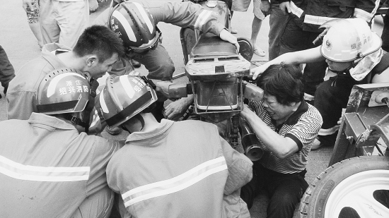 7月21日5时39分,嵊州市三江街道兴盛街发生一起摩托车与三轮车碰撞事故,该事故导致三轮车驾驶员的右手被卷入摩托车后轮内无法取出,痛苦不堪。嵊州市消防大队官兵接警后立即赶到现场展开施救,及时助其脱困,并将伤者将其送往医院进行救治。 (张亮宗吴凯摄)