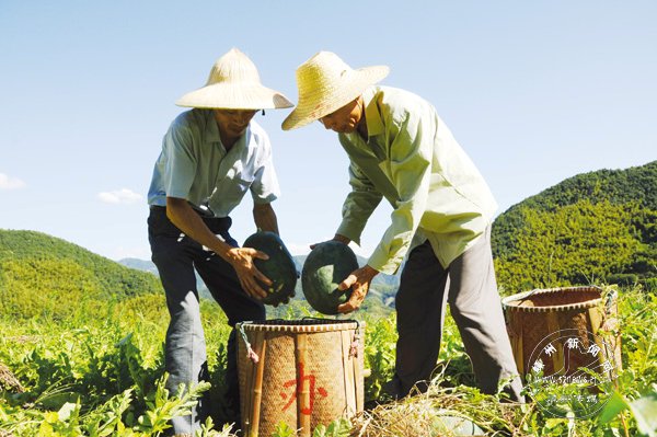 近日,下王镇樟家田村出产的梯田西瓜,再次成为瓜市上的抢手货。樟家田村地势高,昼夜温差大,瓜地用山泉水灌溉,所以梯田西瓜较平原地区的西瓜更甜更脆。据悉,由于天气影响,今年樟家田的梯田西瓜提早上市,该村40余万斤西瓜已被订购一空。图为瓜农正在瓜地里采摘梯田西瓜。
