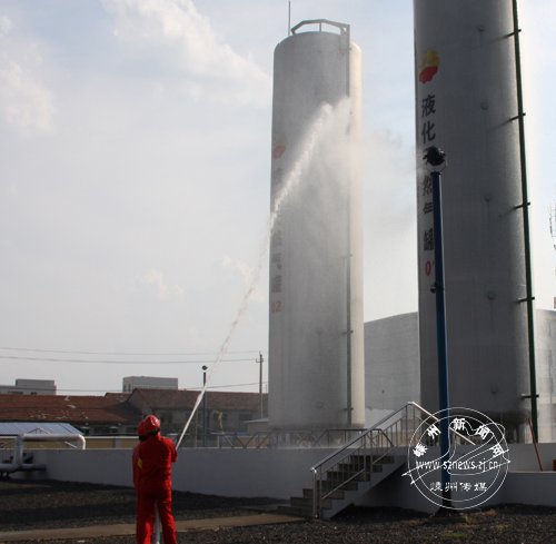 针对高温天易燃易爆的特点,7月25日下午,嵊州中石油昆仑燃气有限公司在该公司LNG储配站开展天然气泄漏消防演练。图为演练现场。