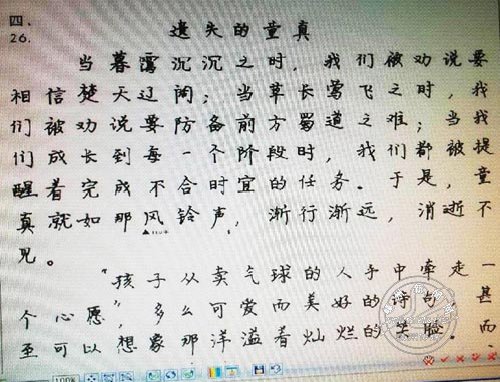 改卷第五天了。批改中发现我们许多考生的审题能力还真是很弱,如下面一些作文通篇不提“童真”,属于完全偏题: