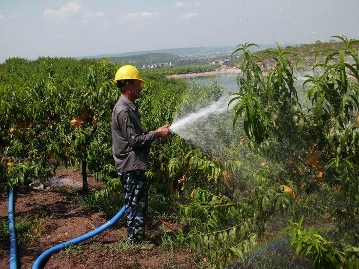 近日来,连续40度的持续高温,可急坏了黄泽镇许多果农。正是黄泽镇石苎行政村石蟹自然村的黄桃大户章玉华所说:“看着马上成熟的袋装黄桃,由于高温一个个被如火的骄阳炙烤落地,心里真的会痛,你看,现在落在地上的袋装黄桃至少6元左右一个,你数数地上已经上万个了。”为了保果,连日来,章玉华他每天早上5点就开始到桃山上用水泵提水喷洒,一直到晚上10点左右才回家。尽最大的努力与老天挣抗着,抗旱保果。