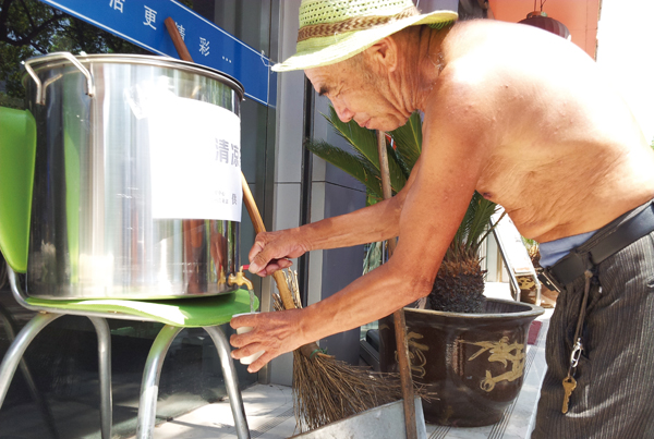 昨天上午10点,一阵忙碌过后,六月霜茶已摆放在天乐数码营业部门口的铁树旁边,74岁的周贤焕老伯第一个喝上了“清凉爱心茶”。周老伯是官河路上的环卫工人,他每天凌晨4点就开始工作,直至晚上10点才能下班,因为天气太热,人手紧缺,他一人顶起了两个班的工作时间。“每天也不知道要喝多少瓶自来水,能喝上这样的六月霜茶,真好!”周老伯喝完后顺手将工具袋里的一大瓶自来水换成“六月霜”,又开始清扫道路去了。