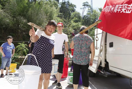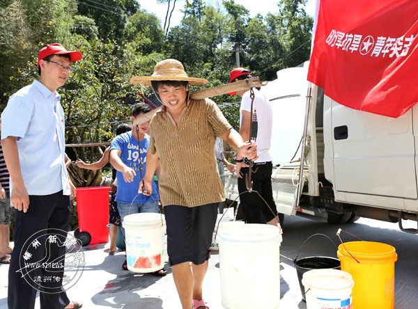 昨日,绍兴团市委、嵊州团市委组织防旱抗旱青年突击队,赶赴下王镇、北漳镇、里南乡等地开展抗旱送水活动,为这些乡镇用水困难的村送去饮用水。图为青年突击队送水到下王镇梅坑村,村民喜滋滋地挑着一桶桶清澈干净的水回家。