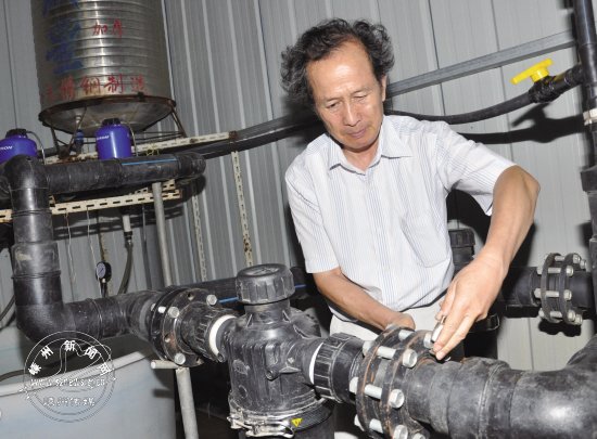 昨日,黄泽省级现代农业综合区的500亩铁皮石斛设施精品园内,用上了施药与抗旱于一体的法国“多利”技术设备。该设备除了施药治病的功能外,使该精品园每百个标准化钢架大棚每小时用水在25吨左右,即节水又抗旱。图为工程师正在对法国“多利”比例加压注液器进行调试。