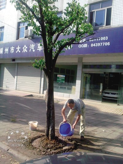天气炎热,一些树木“渴”得受不了,为此,市客运出租公司一些员工从7月下旬以来,每天主动为公司周围的10多棵行道树浇水,为护绿尽力。图为公司员工正在为树木挖坑浇水。