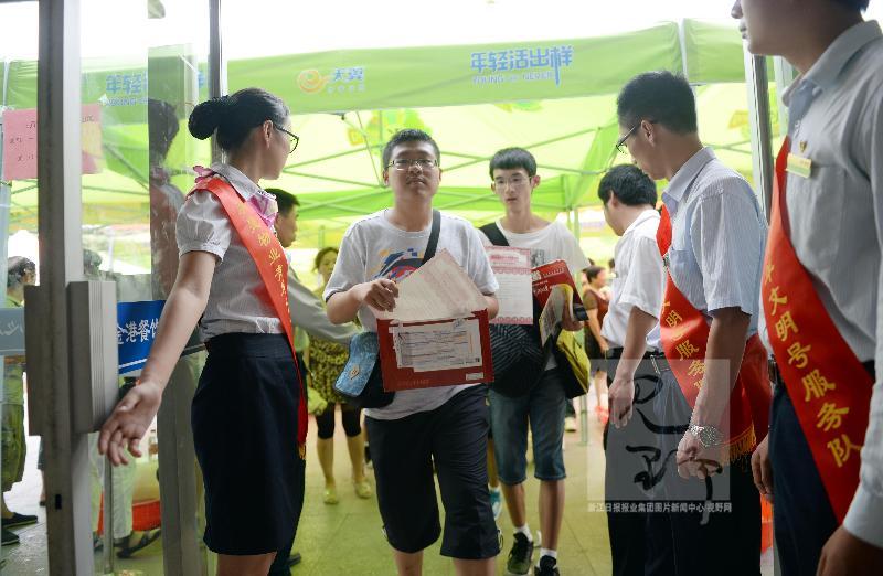 浙江大学2013级本科新生在志愿者的帮助下办理入学手续。