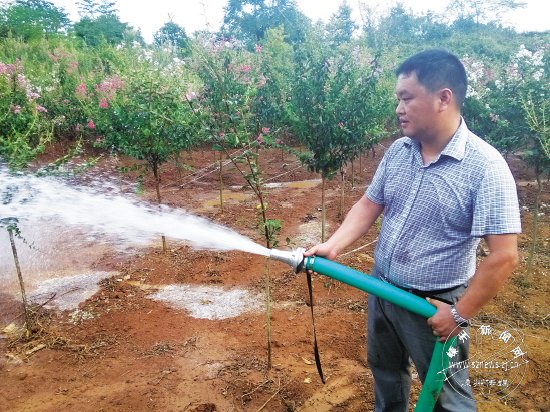 昨日傍晚,市海华绿化有限公司总经理姚柏华和公司员工一起,在位于金庭镇的苗木基地里对紫薇浇水抗旱。据介绍,经过错时浇水,合理灌溉等积极有效的抗旱措施,海华绿化嵊州基地800余亩苗木经受住了此次旱情的考验。