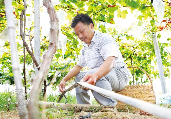三江街道果农竺相林种植葡萄多年,去年,他给他的7亩葡萄园建造了蓄水池和安装喷滴管,有效地控制了果园灌溉的合理性。他说,今年遇上几十年一遇的旱情,通过科学管理和合理灌溉,既不浪费水又保证了葡萄的品质。目前,竺相林的葡萄园挂满了一串串美味的葡萄,前来采摘的游客络绎不绝。图为竺相林正在调整喷滴管位置。