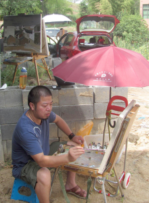 8月20日上午,来自绍兴、嵊州两地的近10位油画家在甘霖镇和尚田村进行写生创作。