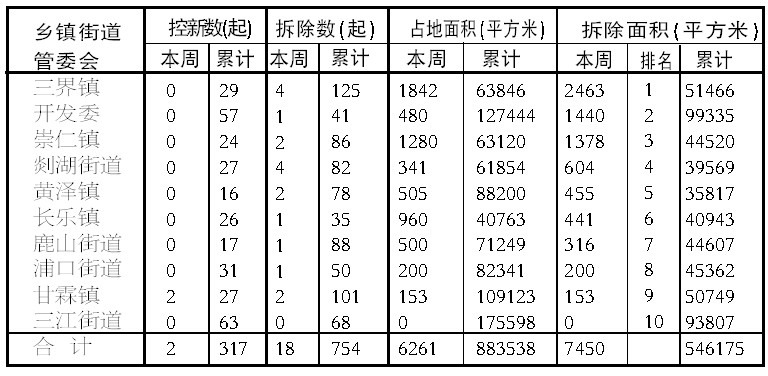 注:1.累计数据是2013年度的数据;2.在百日攻坚期间仅对开发委、五大集镇、四个街道的拆除统计进行排名公布。