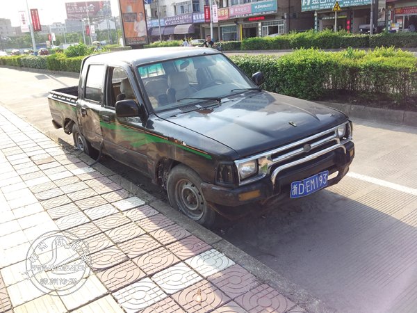 另一辆皮卡车,看上去比桑塔纳稍新一些,但是前方的标志也被挖走了。驾驶室一侧的门是可以打开的,右侧副驾驶的玻璃门已经不见了。