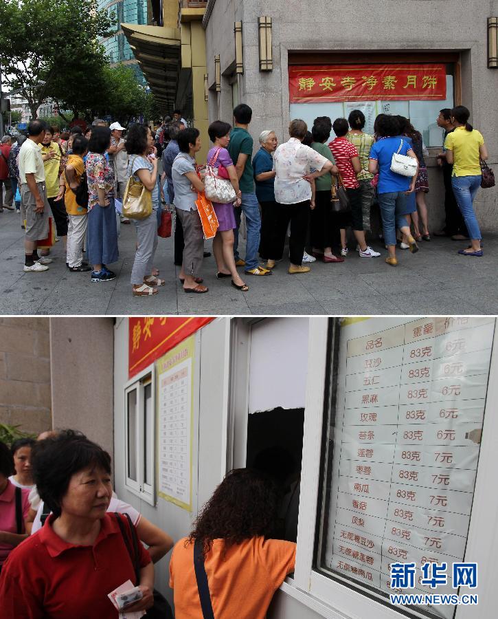 9月5日,市民在上海静安寺外排队购买物美价廉的净素月饼(拼版照片)。