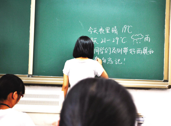 ▲图为生活委员在黑板上抄写次日的天气情况。