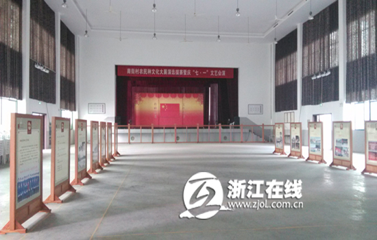 因为礼堂很大,活动凳子不用时就会收起来,放上两排展板,陈列文化和村里文化活动。这么大的空间,如果村民有红白喜事,也可以放在这里当宴会厅。