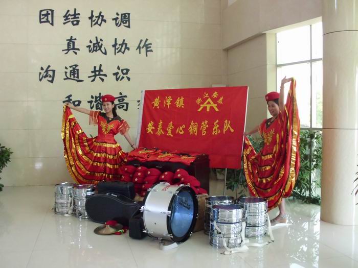为积极响应市委、市政府移风易俗的号召,黄泽镇文化活动中心与浙江安泰交通设备有限公司积极配合,于今年6月成立了“黄泽镇爱心铜管乐队”,此乐队阵容较为庞大与整齐,共有鼓号上阵队员36人,这些队员全部来自黄泽本镇的志愿者,为抓紧时间练习,力争在9月下旬黄泽镇第二届桂花节中队伍亮相及早日让队伍服务于民,浙江安泰交通设备有限公司早在6月份就首先出资2万元,购买了所有鼓号设备,经过近三个月并在专业音乐退休田文强老师的精心指导下,每天晚上的业余训练,如今已鼓声阵阵,号角转声,“走进新时代”、“驼铃”等曲谱让人一听就熟知,队伍已有一定的吹奏技能。