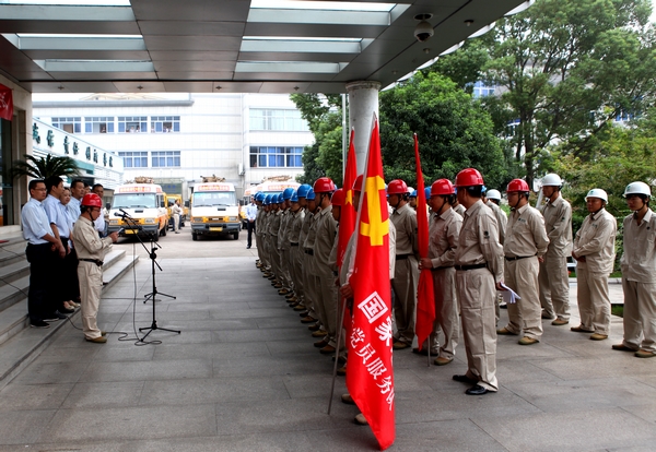 “抗灾抢险突击队出发!”公司总经理谢成荣向抢险突击队授予队旗,并发出出发口令,鼓励全体抢险队员众志成城、万众一心、艰苦奋斗,出色完成此次抢修任务。