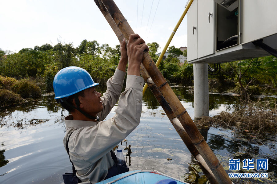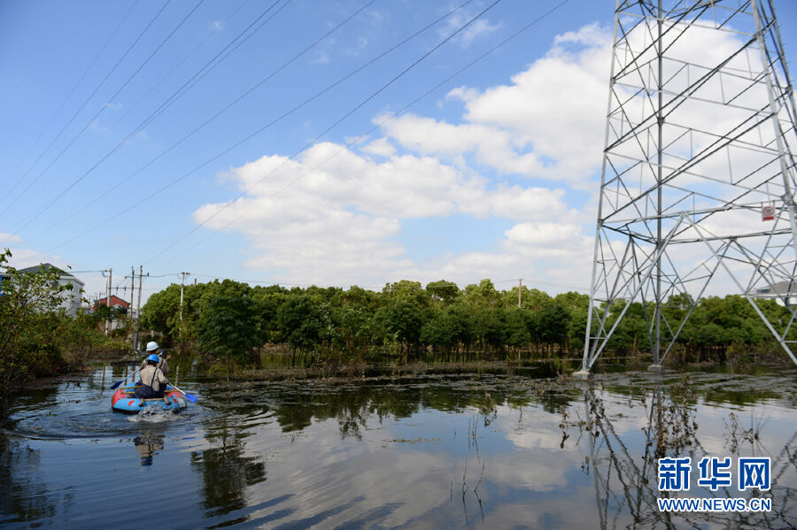 10月13日上午,在余姚市舜宇路北郊村俞嘉桥,由于地处江边,村子积水最深处仍有2米,驰援余姚灾区的国网浙江嵊州市供电公司应急抢修队乘坐皮划艇进入深水区,对配电台区进行巡视、抢修,确保该区域尽早实现通电。新华社发张小龙