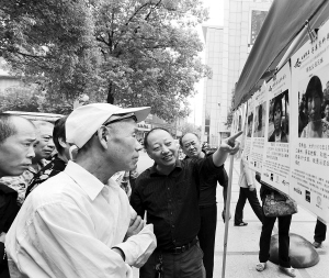 嵊州市的大海捞真寻亲义工团队,从2008年开始在该市城市广场定期设立“寻亲角”,发布山东威海、夏津等地的寻亲信息,让300多位山东市民寻找到了浙江的亲生父母。寻亲义工的爱心之举,解了一个个山东游子的“思亲苦”。图为10月11日,嵊州市城市广场“寻亲角”,市民正在阅览寻亲资料。(记者张亮宗摄)