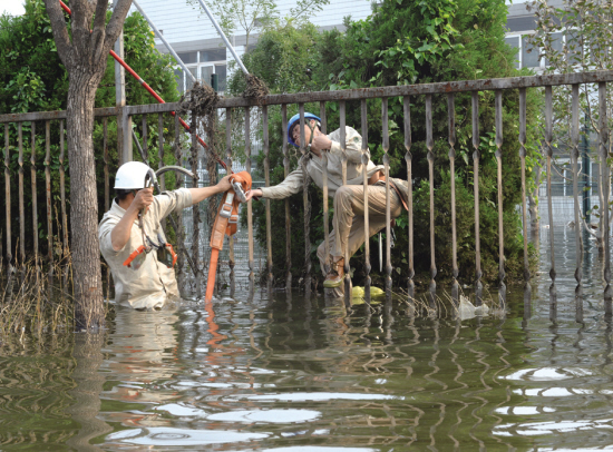 10月14日上午8点30分,我市供电公司抢修队员开始对虹新支线进行抢修,由于该线路所经区域地势低洼,导致村中道路严重积水,大部分水位已经漫过腰部,抢修队员只能借助特殊工具经过深水区进行抢修。