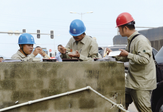 10月14日下午1点,刚从余姚市10千伏舜创和横路双回路线检修送电现场回来,趁着中午吃快餐的空隙,市供电公司驰援余姚抢险队三队队长金成用手机给家中打电话报平安。