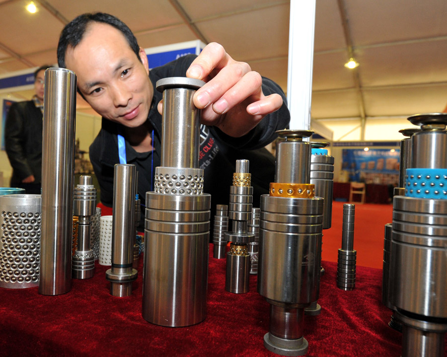 10月23日,浙江西门冲片有限公司技术人员在介绍用新科技、新材料制造的新产品――电机冲片。