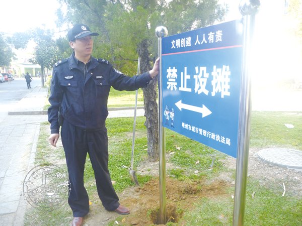 10月29日上午,在越秀北路原马路市场地段,城管执法局剡湖中队的几名执法队员正在安装一块温馨提示牌,上面有“禁止设摊”的字样,还标注了部分《浙江省城市市容和环境卫生管理条例》的内容,要求经营户自觉遵守。安装提示牌是解决马路市场、建立长效机制的举措之一。剡湖中队步巡分队队长葛峰告诉记者,在流动摊摆放比较多的路段设置这块温馨提示牌,目的就是要让老百姓知道这里是严管区,是禁止设摊的。