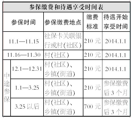 1.参保人员超过缴费期后要求参保,2014年3月25日前参保的,其费用按全年个人缴费标准210元缴纳;2014年3月26日起参保的,其费用按筹资标准700元(含财政补贴490元)缴纳。医疗保险待遇从参保缴费当月起的三个月后方可享受。