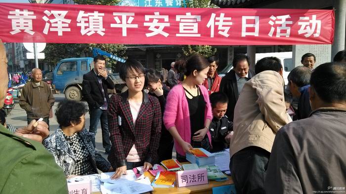 11月5日上午,黄泽镇人民政府联合派出所、计划生育、综治中心、禁毒反邪等部门,在黄泽镇中心人口密集区,开展了黄泽镇平安宣传日活动,镇上及周边村的村民积极参与、询问,普遍反应良好。