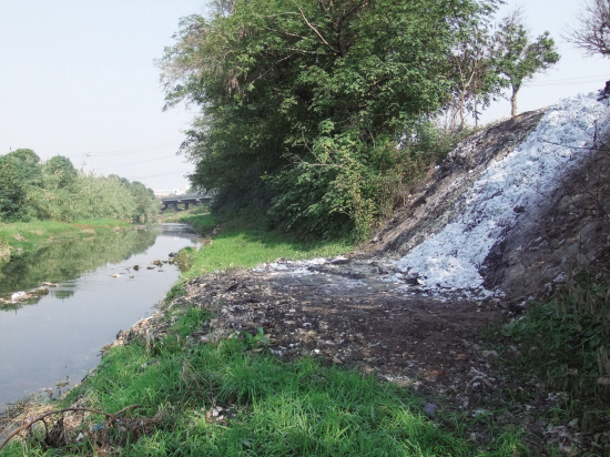 然而,岸边的垃圾却大煞风景。就在江的东岸边,倾倒着一些纺织废料。这些纺织废料从绍甘线路边一直滑落到河床,犹如一条白色的瀑布,非常醒目刺眼。仔细一看,这里还有曾经焚烧过纺织废料的痕迹,10米左右的范围都没有草,应该都是以前倾倒废料的范围。