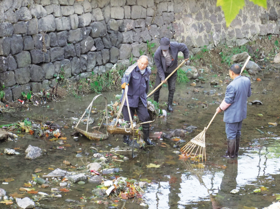 11月25日,记者在金庭镇花桥坑晋溪段看到,4名村民脚穿套鞋,手持工具,在河道中淌着河水,清理垃圾。他们将浮在水面的垃圾装在畚箕中,再挑到岸上,装上三轮车,运到远处的垃圾场。记者看到,从晋溪小学门前的桥开始,已经有几十米的河道被清理得干干净净。