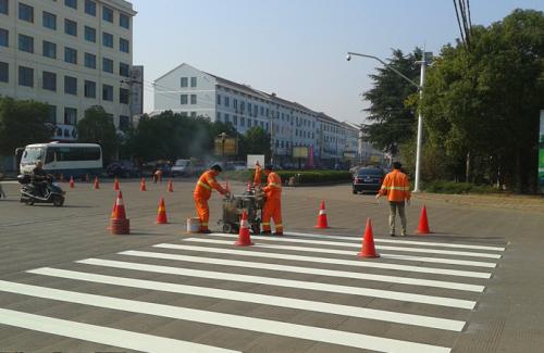 近日,为规范镇区交通秩序,提升集镇形象,该镇联合市交建所,对镇区桃源路、秀山路、桃源横路、桃源支路、东山路等5条主要街道,设置了双黄线、斑马线、减速带等交通标志标线。图为桃源路老绍甘线路口,工人们正在紧张有序地施工。