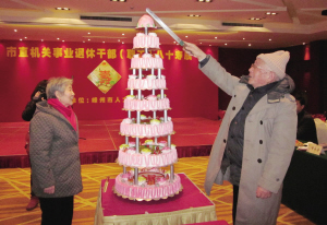 昨日下午,东浦社区举办第八届寿星联欢会, 82位寿星参加了此次联欢会,其中年龄最小为70岁,最大为96岁。据了解,从2007年开始,社区每年都这样为寿星集体过生日。图为小朋友们在喂蛋糕给老人吃。(马玉龙 童灵敏)