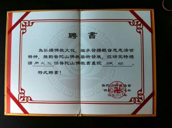 就受聘普陀山佛教书画院顾问事宜,记者特地联系周天黎。 周天黎表示:自已虽不是佛教徒,但她认为不管是佛教、基督教、道教、伊斯兰教等,都属于宇宙哲学和精神追问的范疇,并不是世俗层次的求神拜佛之迷信状态。而且,理理相通,诚如老子曰:‘源天地之美而达万物之理。’上述各种教义的真善美的最高峰上是有共通点的,可以光明顶上同傲游。同时,佛学乃中国传统文化三根支柱之一,其唯识论更是认识世界的一门重要学科。普陀山又是中华民族民间社会公认的佛教重地;是观音的道场,佛礼天下、普渡众生。自己也愿意借此为人类社会的和谐尽一分微力。
