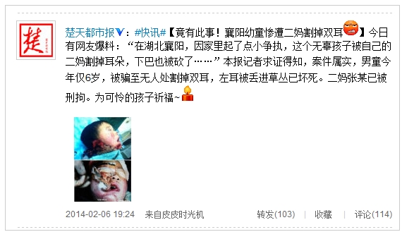 “2014令人怒火之残忍惨剧]博友爆料:"事情发生在湖北襄阳,因家里起了点小争执,这个无辜孩子被自己的二妈给割耳朵了,下巴也被砍掉了,她把耳朵砍掉之后把耳朵扔进了厕所,捞上来耳朵已经坏死,如此丧尽天良必遭天谴!