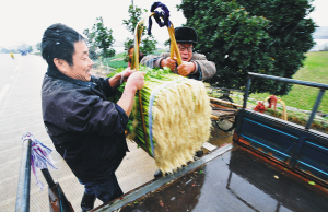 昨日,嵊州市多家蔬菜市场的采购人员顶着雨雪、冒着严寒在各蔬菜基地采收蔬菜,以保证市民在雪天能吃上新鲜的蔬菜。图为一菜商正在崇仁镇的一处蔬菜基地里收购蔬菜。 (记者 张亮宗 摄)