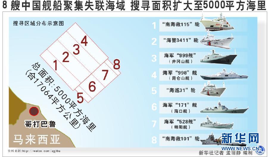 图表:8艘中国舰船聚集失联海域搜寻面积扩大至5000平方海里新华社记者孟丽静编制