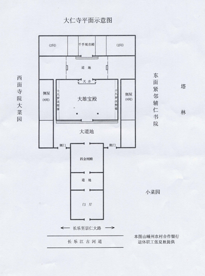 大仁寺坐落在离石璜镇上公路桥(俗称下桥)向南四里处的寺根村西端。据该村老人回忆,大仁寺的殿宇有山门三间、四金刚、韦驮殿、大雄宝殿、千手观音殿;还有供住持和尚进行佛事、住宿以及种植寺田所需的用房,详情参见本文所附的示意图。东首围墙外为辅仁书院,还有面积约三亩安葬已故和尚的塔林,寺区总面积达5000多平方米。前些年,寺北围墙外的良田中,村民耕作时还发现口径约二市尺的磉盘,可见,寺区面积原先还要大。寺前,是崇仁通向长乐的大路,路南与从西向东流的剡溪(现称长乐江)相毗连,民国初寺前不远处是簰埠头,长乐江改直后“江床”向南移。寺西是现称猫狸洞的小山,为殳印山南尾部的一角,历史上曾一度称作“独秀山”。小山与平地间有深坑,“曾以垮坑的大树根当桥”[1],故称“树根”,后演变成“寺根”这个村名。