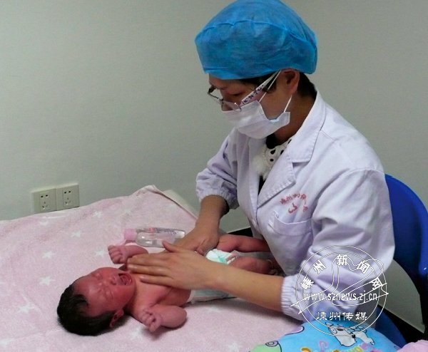 图为医护人员为出生才4天的婴儿洗澡后进行护理。 (钱宁儿 摄)