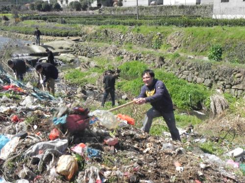 大坑溪两边布满了塑料袋、菜叶、酒瓶、马桶等生活生产垃圾,俨然一个垃圾回收站。青年志愿者们带着手套,拿着锄头、镊子,将垃圾清理到垃圾车里。经过近两个小时的努力,青年志愿们清理出一卡车的垃圾,原来脏兮兮的大坑溪终于变得干净了。青年志愿者们希望通过这样的行动来唤起村民爱护环境的意识。