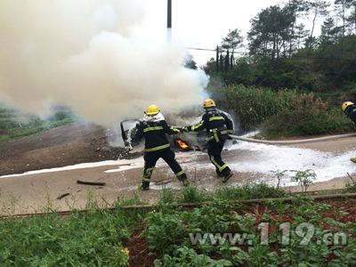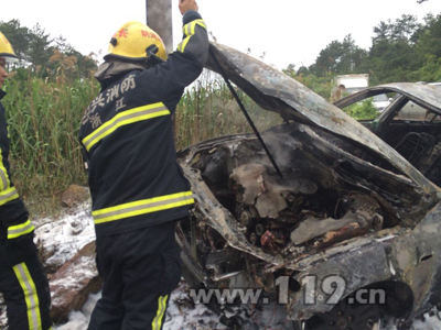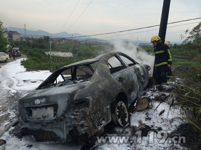 4月23日下午4时14分,嵊州消防大队接到报警称,新市到中碧溪附近一辆轿车在行驶中不小心撞向路边电线杆突发大火,请求救援。接警后,嵊州市消防大队鹿山中队立即出动1辆水罐消防车和7名消防官兵赶赴现场施救。