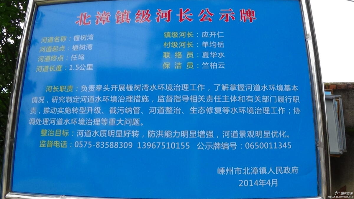 北漳镇河长公示牌:明河段、明责任、明目标,强队伍,强监督,强实效。