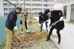 图为该校一学生家长为学校送来了两卡车共20多株无患子树和红枫树,为已经竣工的风雨操场增绿添彩。