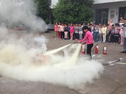随着警铃声的响起,演练现场负责各安全出口的老师及时到位,安排在楼梯处的老师、操场接应的老师都准备就绪,班主任协同合作带领学生从教室前后门以最快的速度做好疏散、引领工作。同学们运用平时所学习的火灾发生时自救常识,用湿毛巾或衣服捂住口鼻,弯腰低姿向操场快步走去,井然有序地撤离班级并到达各班集合地点集合,整个过程没有发生叫喊吵闹、推拉拥挤的现象,全校6个班“逃生”过程只用了30多秒时间。随后,安全主任带领学生一同体验了灭火器的使用方法。