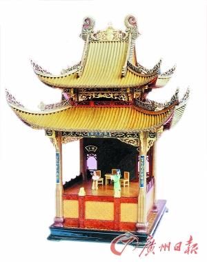 俞樟根竹编作品《越乡古戏台》,作品大约42厘米长、37厘米宽、56厘米高。
