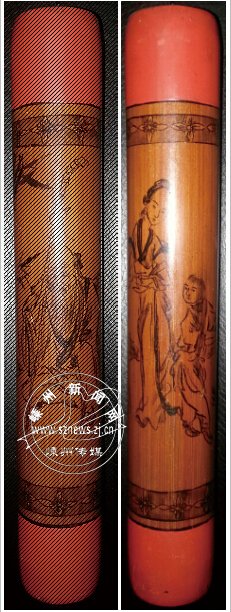 线板、线竹筒与针、线、顶针、小剪子等组成了简朴、实用的家居必备用品,用于日常缝纫和修补衣、裤、鞋、帽、袜、巾等。线板、线竹筒的取材一般为木、竹料,多做成瘦长形。人们将各色丝线从上到下分段绕聚其上,既使线不乱又便于取用。面上常刻(绘)有图案:有喜庆的、吉祥的,也有反映家庭教育寄托家风的等等,十分美观,刻(绘)“嫁”字的则是嫁装之一。此线竹筒,面上画有寿星及教子图等,两端着有红漆,增添喜庆。