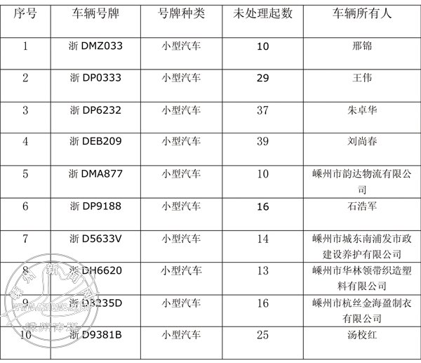嵊州市5起以上违法未处理车辆列表(六)